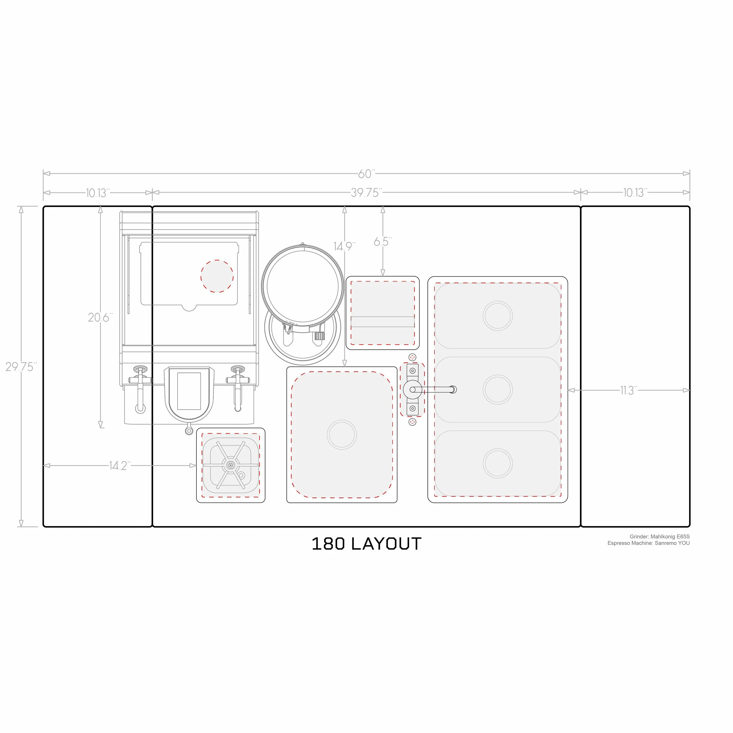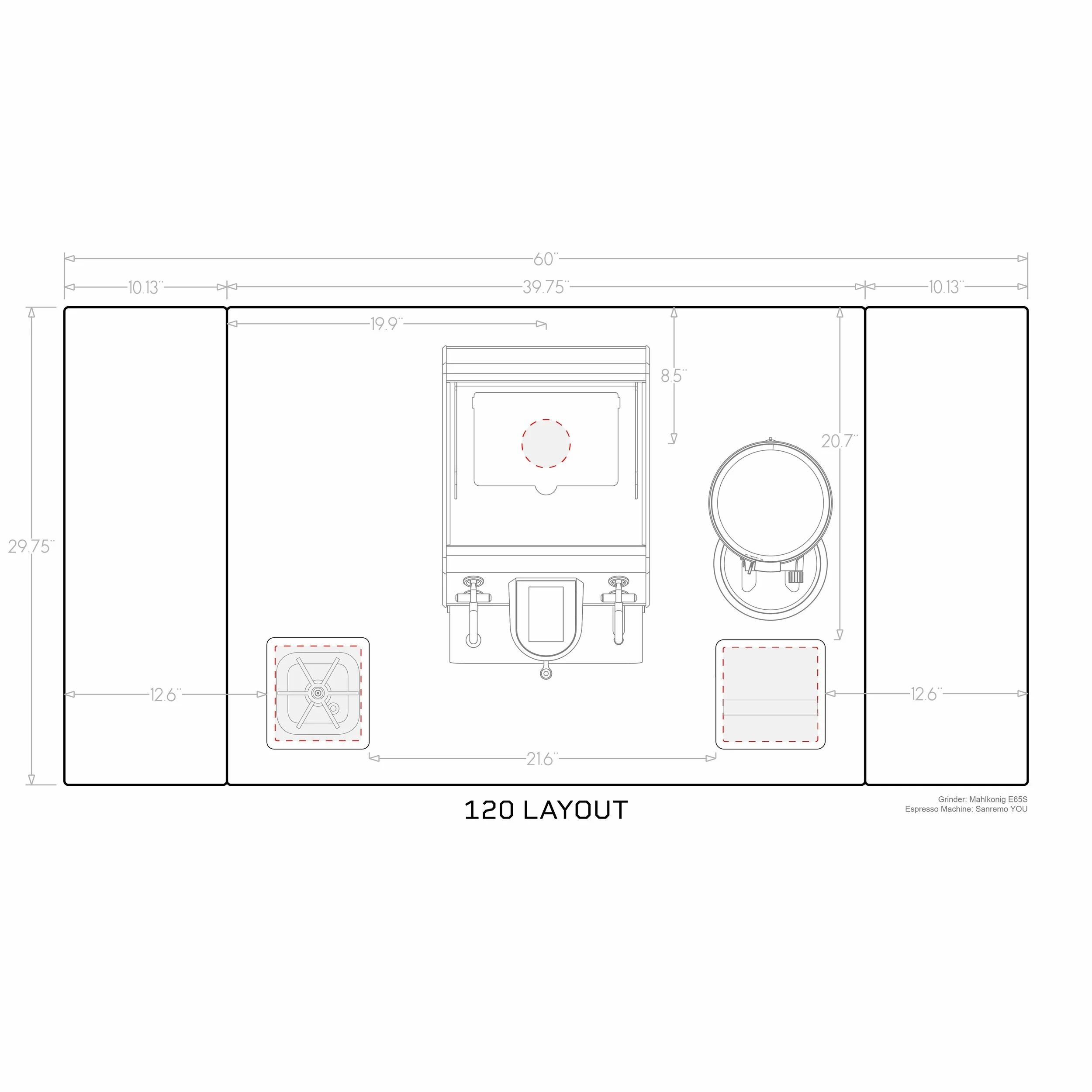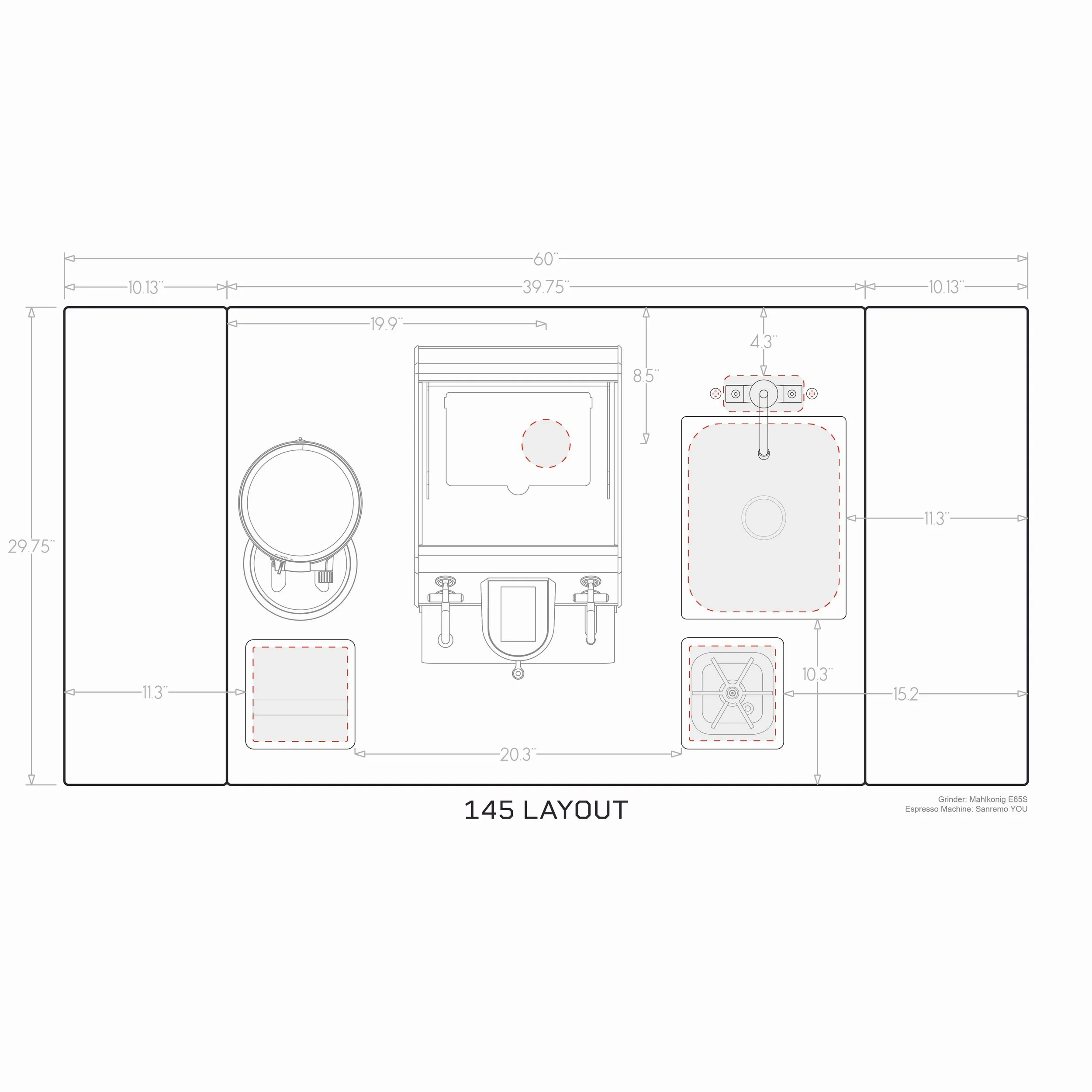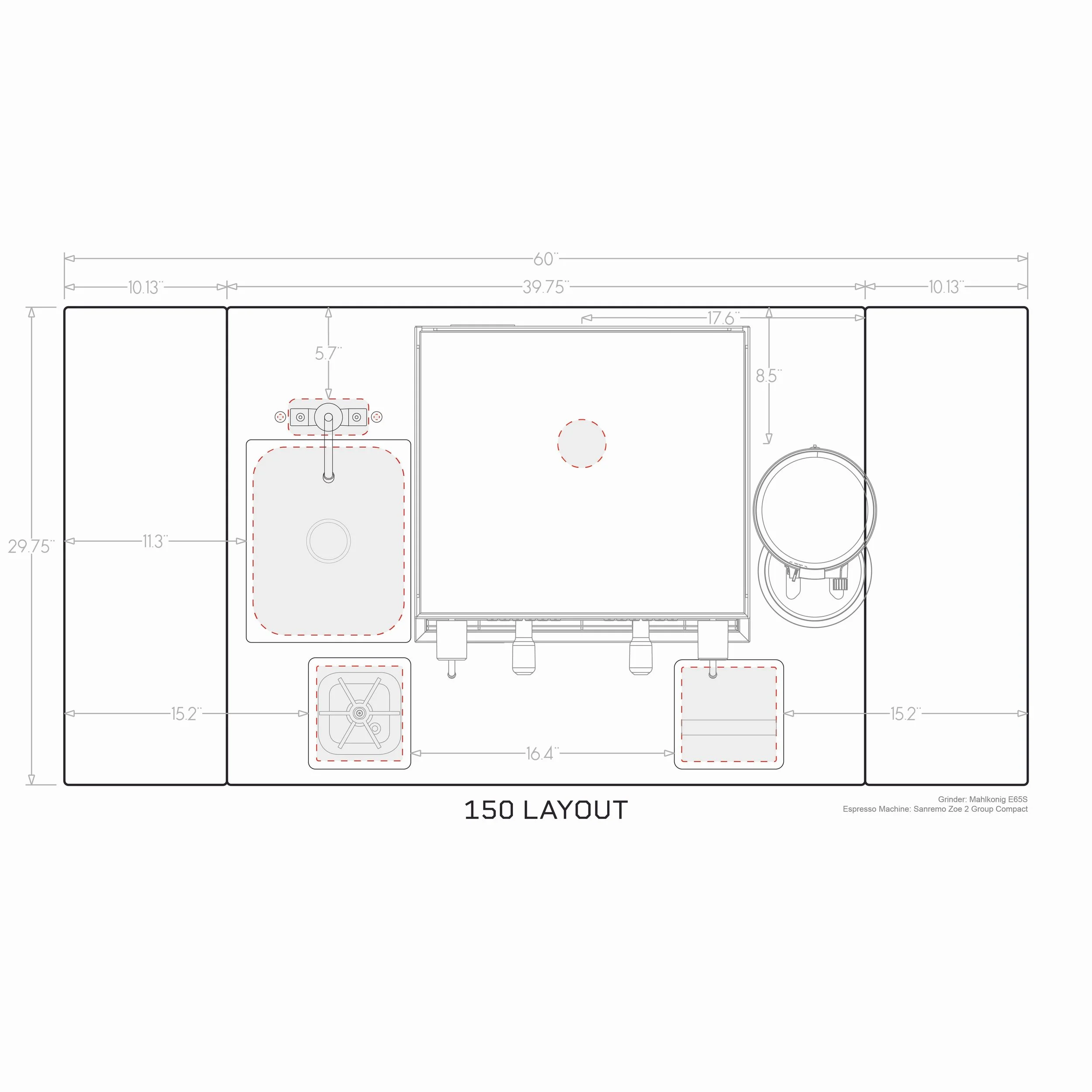 150- rinser and sink/faucet on left, cord/hose, knockbox on right (optimized for Sanremo Zoe or similar)