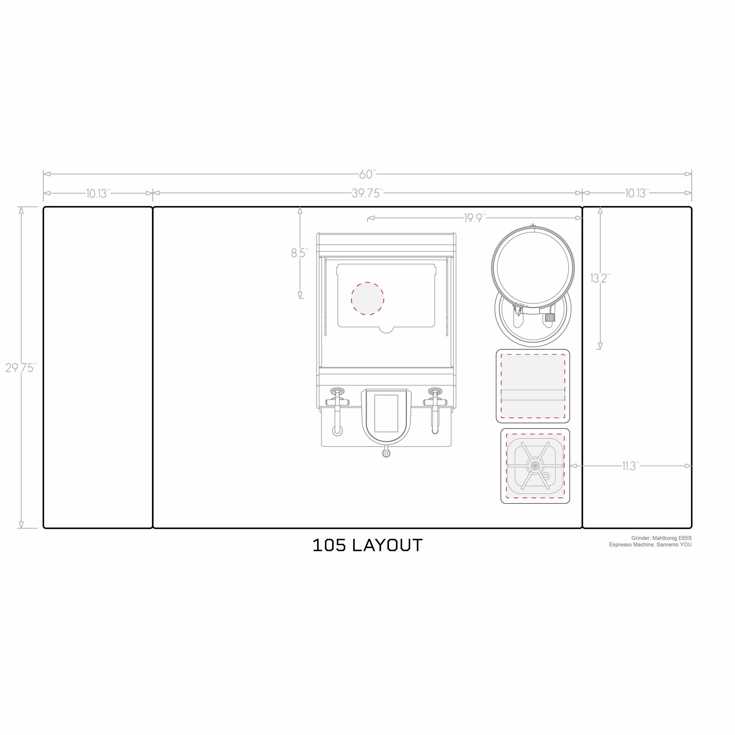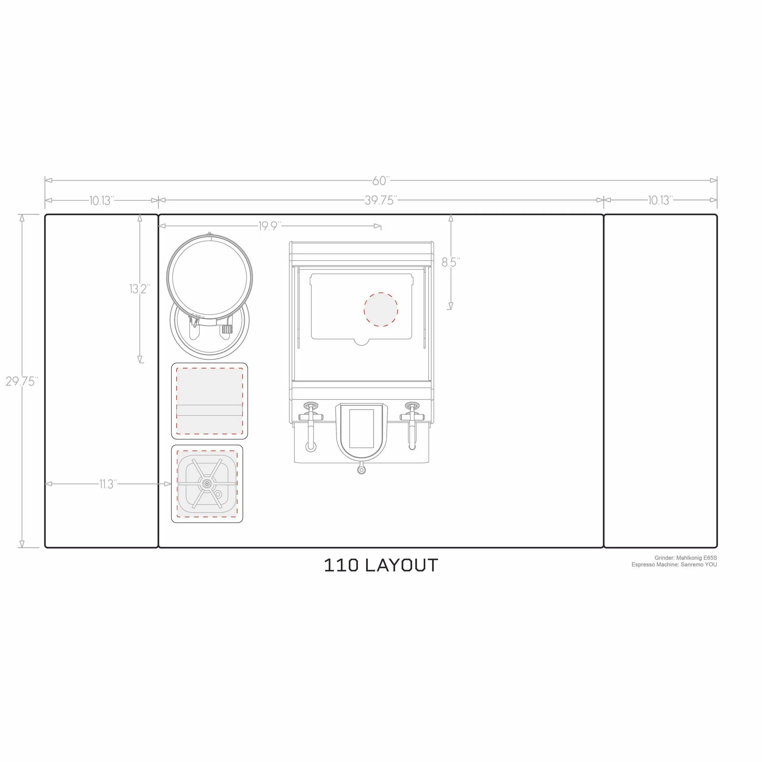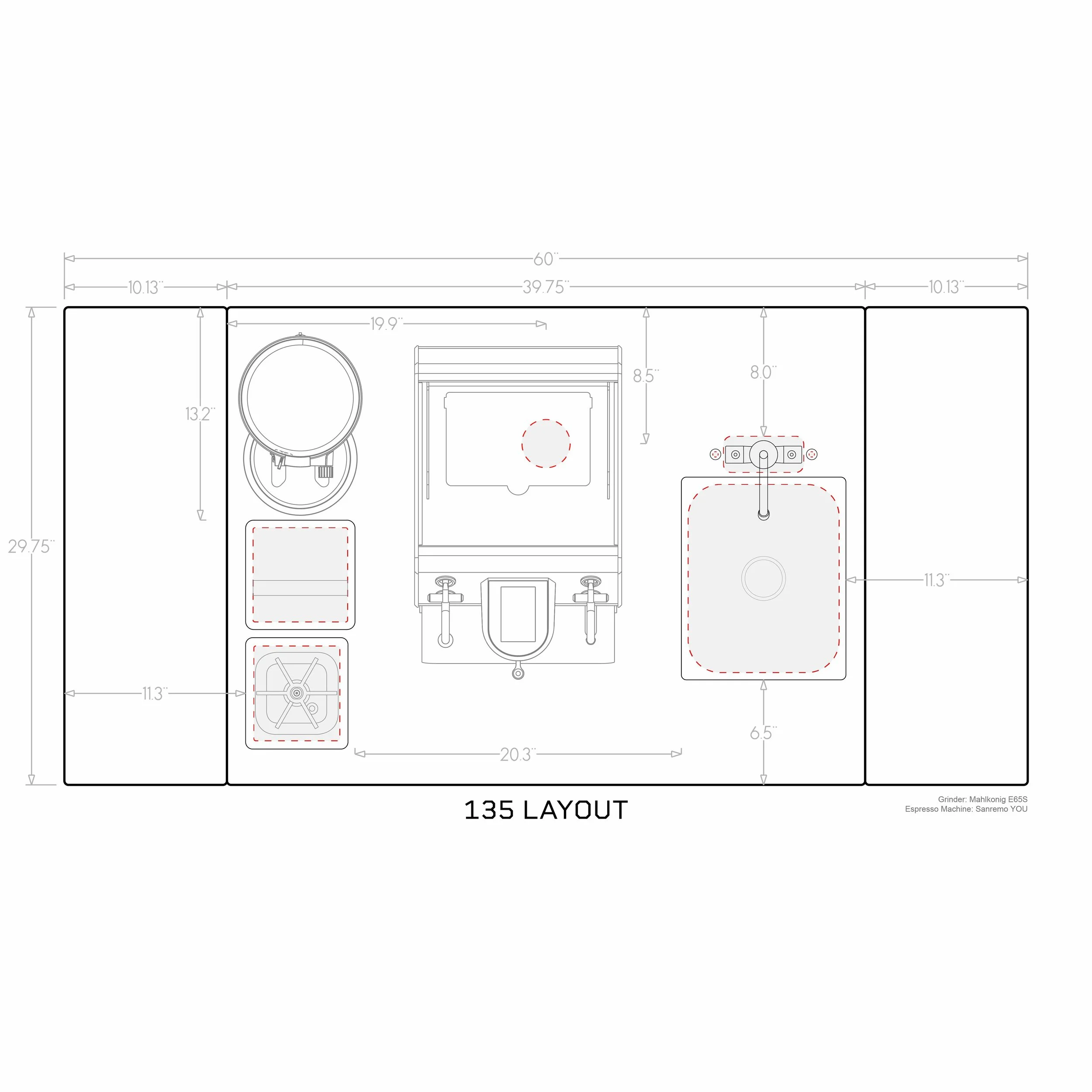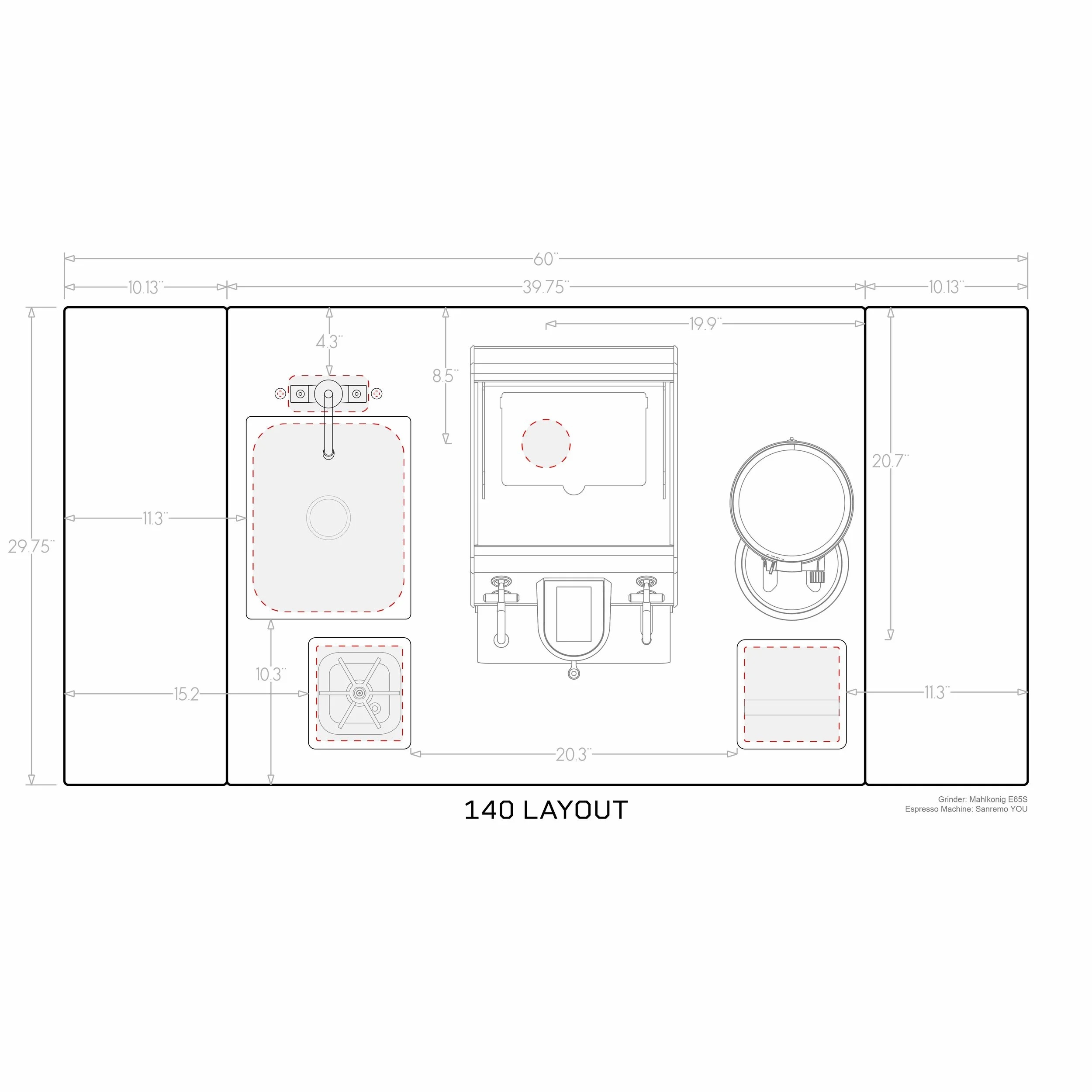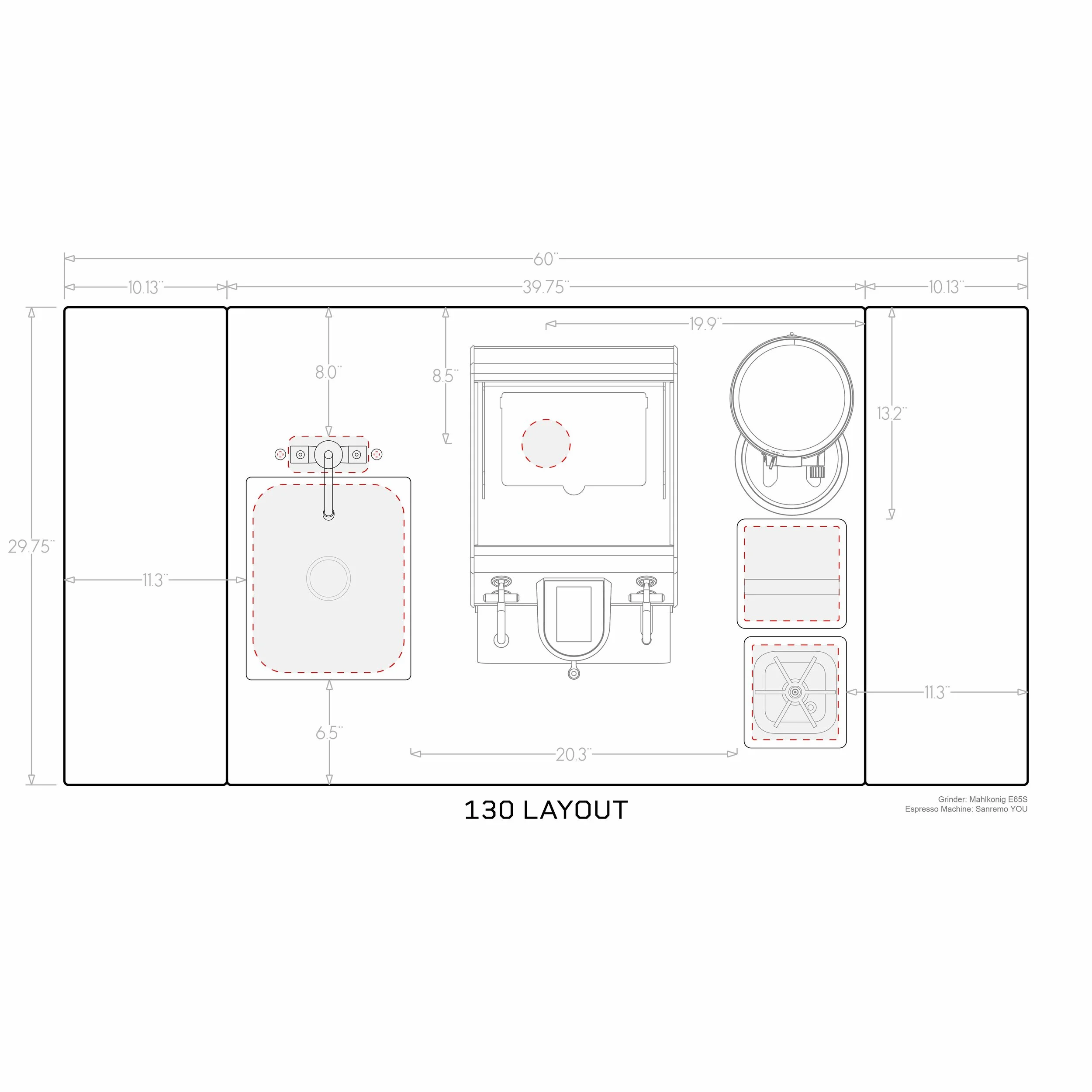 150- rinser and sink/faucet on left, cord/hose, knockbox on right (optimized for Sanremo Zoe or similar)