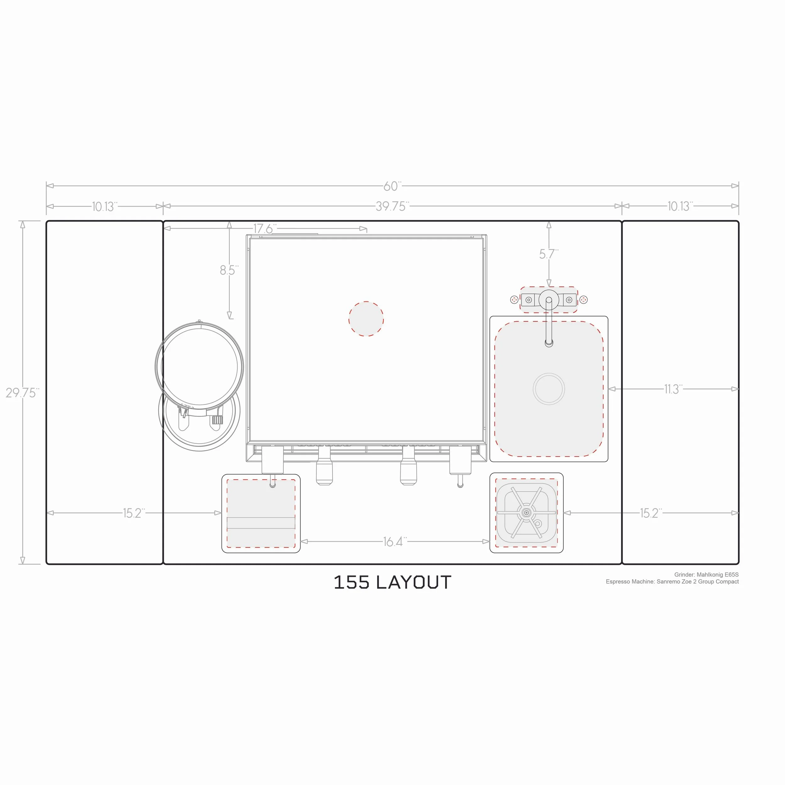 155- rinser and sink/faucet on right, cord/hose, knockbox on left (optimized for Sanremo Zoe or similar)
